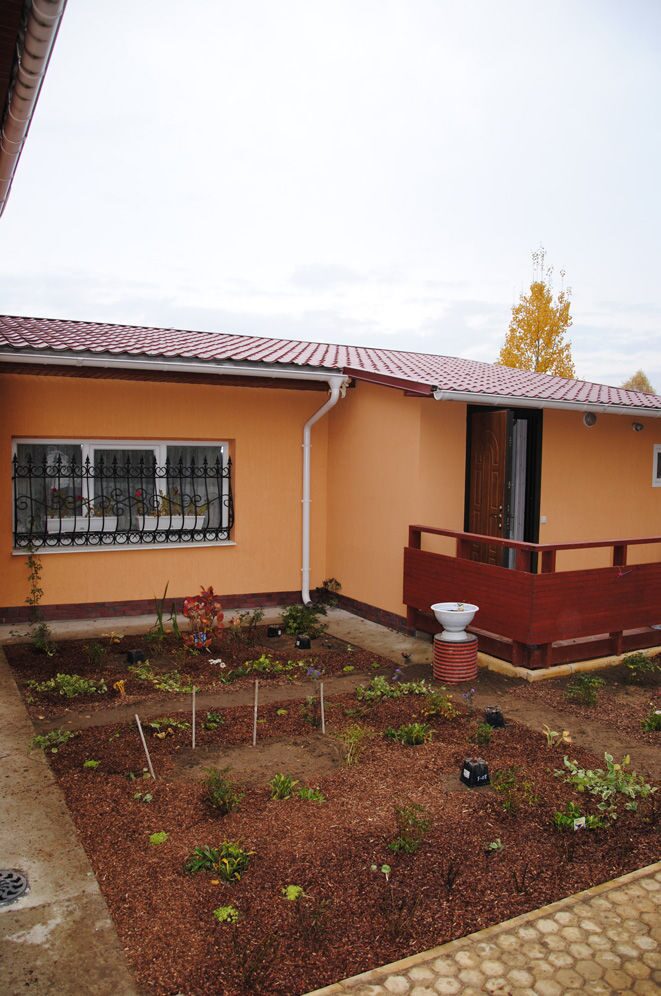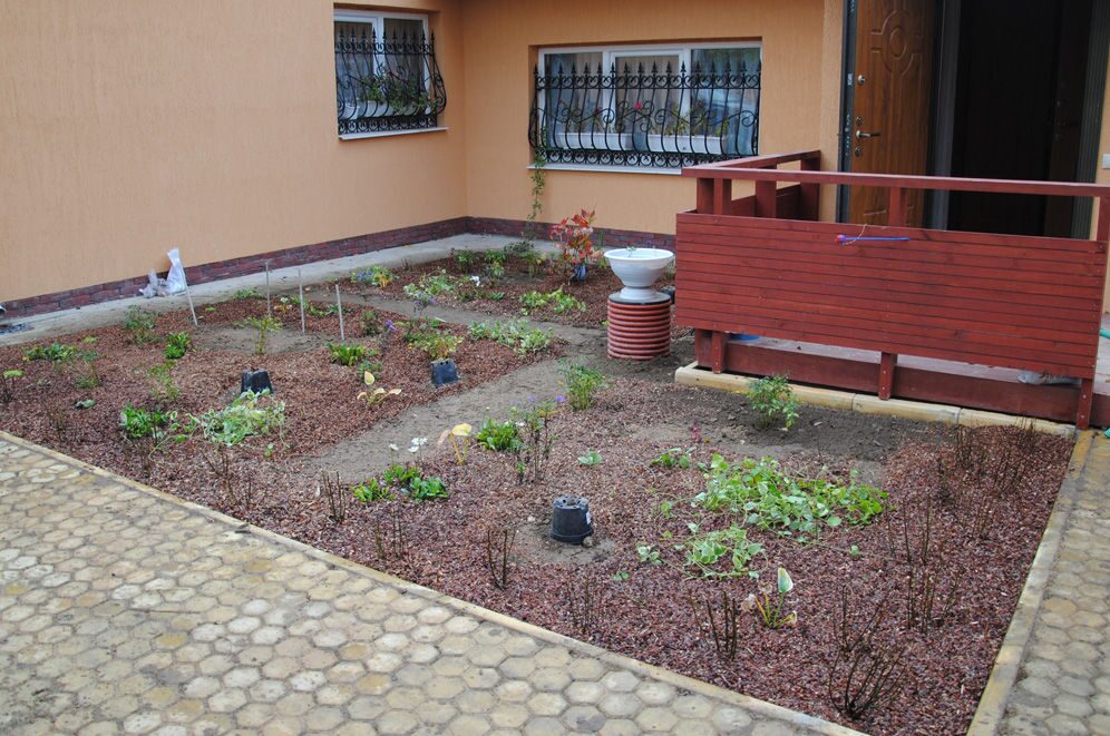 Проводя благоустройство территории этого участка, мы старались максимально вписать его окружающую его природу, одновременно подчеркнуть разницу между естественным и рукотворным ландшафтом. Для этого была произведены выемка грунта для выравнивания территории, а пограничная, возвышающаяся часть примыкающих участков укреплена невысокой бетонной стенкой. Таким образом, абсолютно ровный участок оказался в искусственно созданной низине. После разметки были определены места для пешеходных дорожек, парковки автомобиля, клумб и газонов. Если для устройства дорожек было выбрано мощение тротуарной плиткой светлого оттенка, то место для автомобиля было выложено небольшими бетонными модулями, имитирующими сетку. Такой вариант обустройства парковочного места позволяет оставлять больше площади для растущей травы, одновременно защищая её. Для устройства газонов и клумб был использован разнообразный посадочный материал – это и стелющиеся растения, и кустарники, и многолетние цветы. Мы постарались максимально задействовать всю свободную площадь участка для создания насыщенной зелёной зоны. Вместе с тем мы очень продуманно и рационально произвели планировку, чтобы взгляд не наталкивался на пустоты и искусственный ландшафт не вступал в диссонанс с естественным. На сравнительно небольшом участке мы органично совместили альпийскую горку и парковочную площадку, брусчатку из искусственного камня и всегда росшие здесь берёзы, строгую геометрию здания и участка с волнообразным окружающим пейзажем.