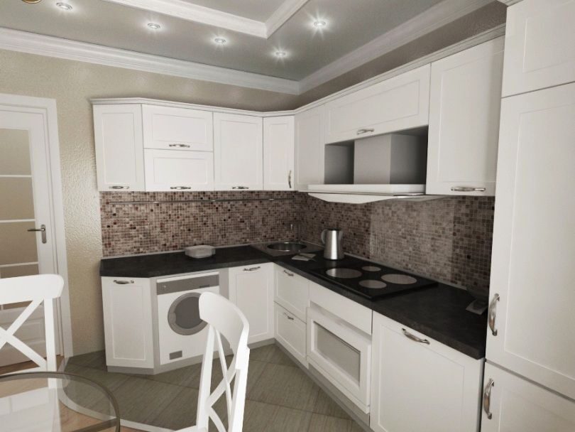 Геометрия комнаты и кухни акцентирована окантовкой потолка со вставленными спотами, а диагонально расположенные закругления углов только подчёркивают совершенство пропорций. Зеркальные дверцы встроенного шкафа в комнате визуально раздвигают пространство, которого всегда не хватает в небольших квартирах. Сочетание светло- серого и бежевого оттенка наилучшим образом располагает к отдыху, а контрастная чёрно-белая гамма создаёт необходимый баланс цвета. Увеличению объёма способствует всё – и скрытый монтаж инженерных коммуникаций, и небольшие точечные светильники, врезанные в подвесные потолки.