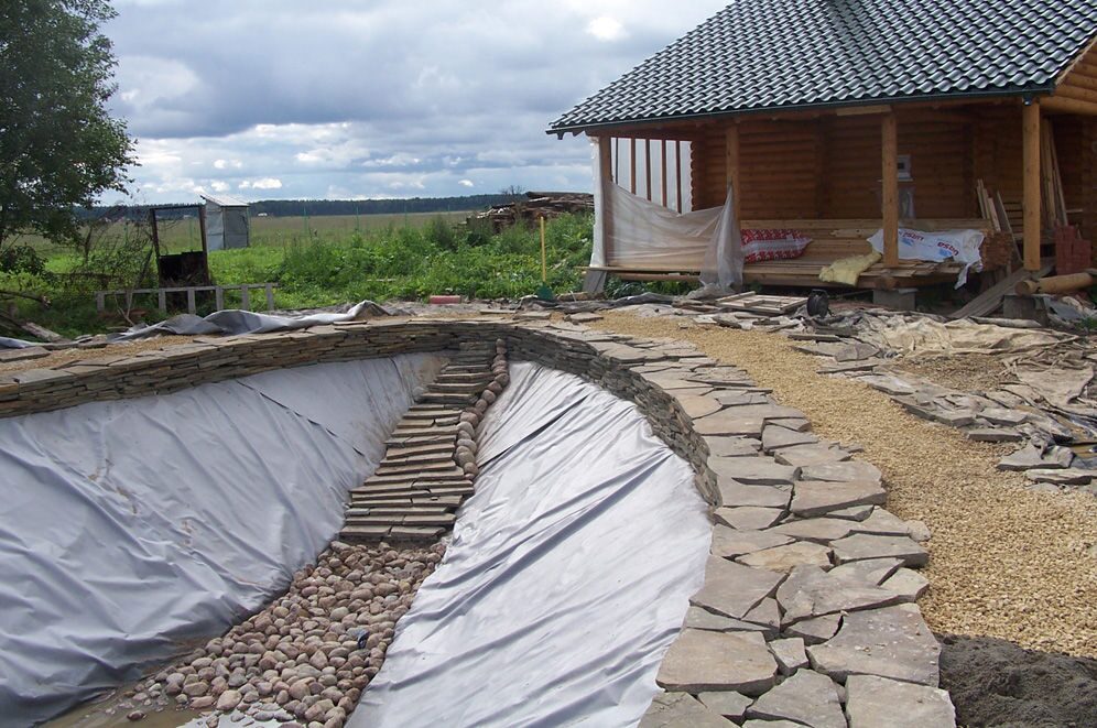 Когда создавался этот дизайн проект участка в городе Гатчина, было намечено сделать достаточно большой пруд. Он должен быть главным украшением территории. Была произведена разметка будущего водоёма, выкопан котлован и застелен бутил-каучуковой резиной, пригодной для больших прудов. Засыпав дно крупным камнем, мы сложили из плит ступени спуска и такими же плитами оформили берега. Затем вся поверхность котлована была выложена булыжником. Камни несли и декоративное и функциональное назначение. Проектирование водоёмов не обходится без создания рядом с ними альпийских горок, садиков из камней или посадки декоративных растений. Мы устроили около нашего пруда очень гармонично вписавшуюся в окружающий пейзаж композицию из каменной горки с декоративными мхами и кустарниками.