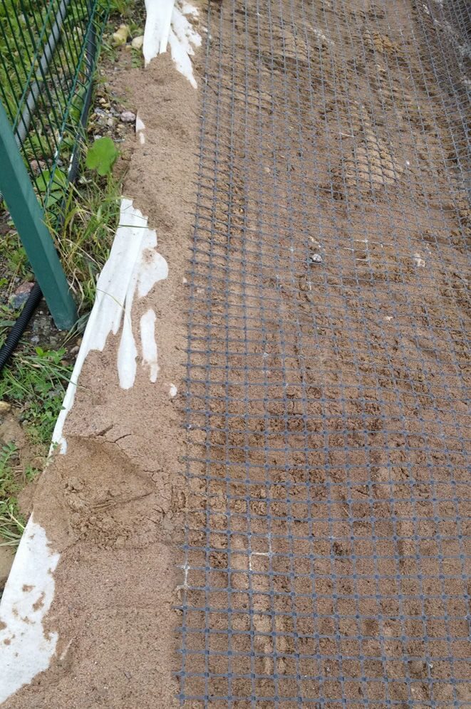 Реконструкция ограждения и выполнение земляных работ проводились в строгом соответствии с существующими для устройства складских площадок технологическими установками и нормативами. Была произведена разметка и частичная выемка грунта для установки конструкций, удерживающих сетчатое ограждение. Столбы из металлического профили приваривались к основанию , а затем бетонировались. С наружной стороны ограждения был сделан скат, своеобразная «приграничная территория», позволяющий дождевой воде беспрепятственно уходить со складской площадки в дренажную канаву. Для устройства этого ската была проведена трамбовка грунта, последующая подсыпка песком, укладка изоляционного полотна и присыпка его гранитным щебнем. Было произведено армирование откоса для последующего закрепления его бетонной смесью.