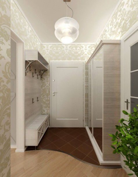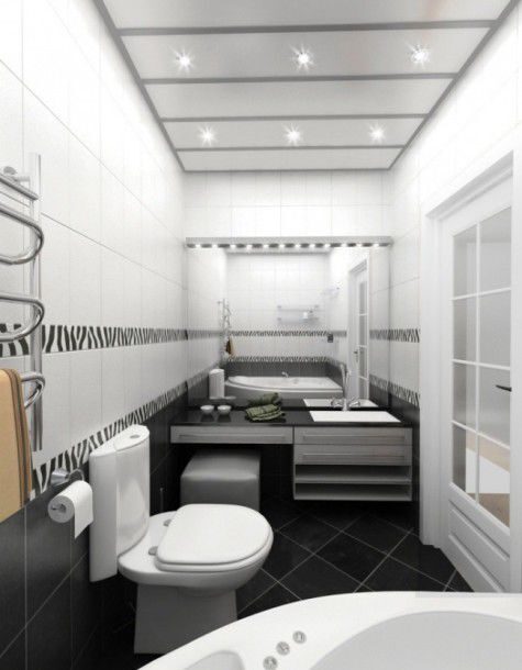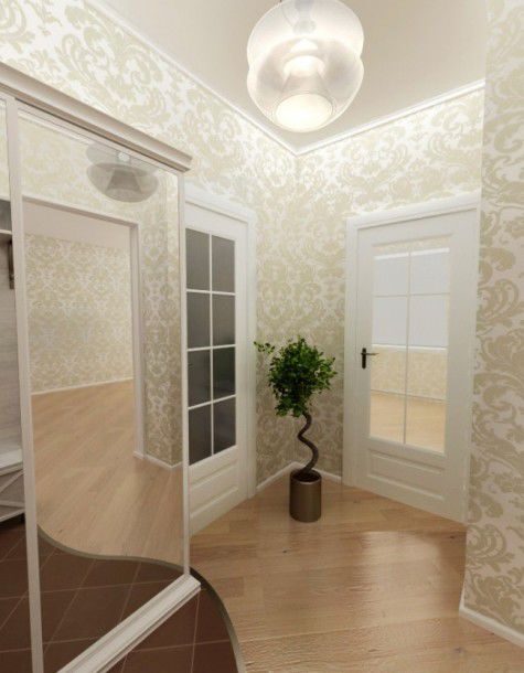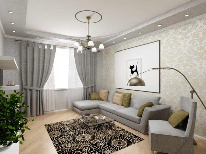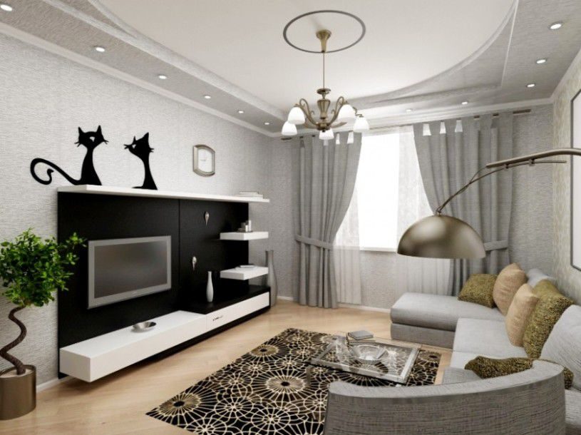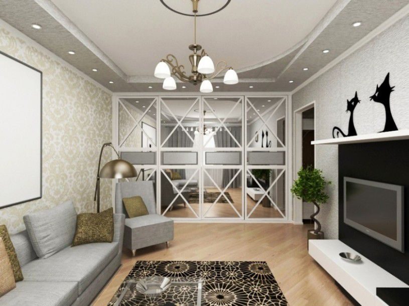 Геометрия комнаты и кухни акцентирована окантовкой потолка со вставленными спотами, а диагонально расположенные закругления углов только подчёркивают совершенство пропорций. Зеркальные дверцы встроенного шкафа в комнате визуально раздвигают пространство, которого всегда не хватает в небольших квартирах. Сочетание светло- серого и бежевого оттенка наилучшим образом располагает к отдыху, а контрастная чёрно-белая гамма создаёт необходимый баланс цвета. Увеличению объёма способствует всё – и скрытый монтаж инженерных коммуникаций, и небольшие точечные светильники, врезанные в подвесные потолки.