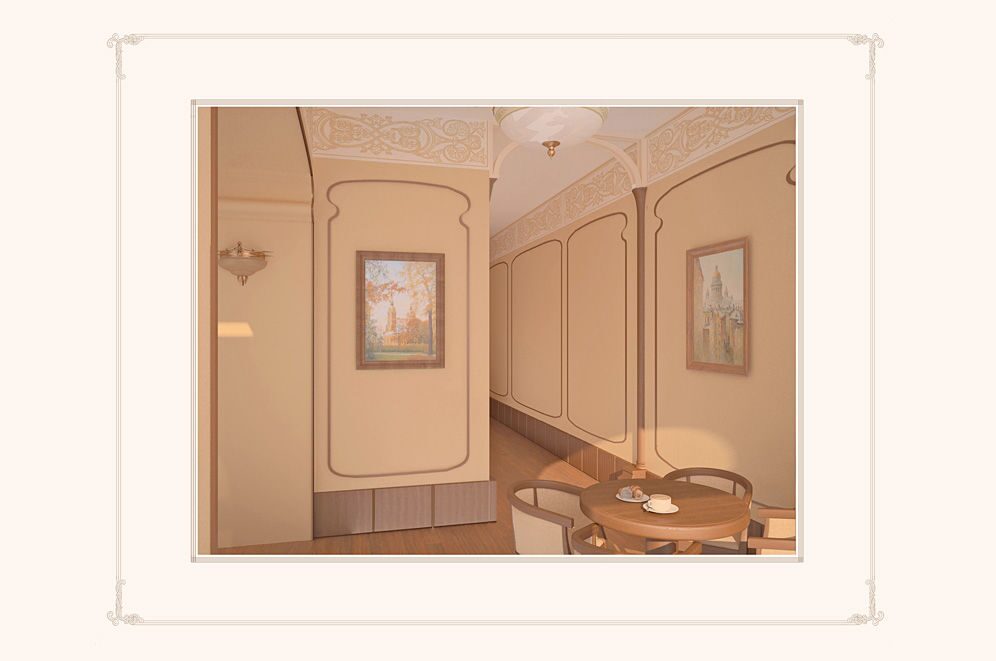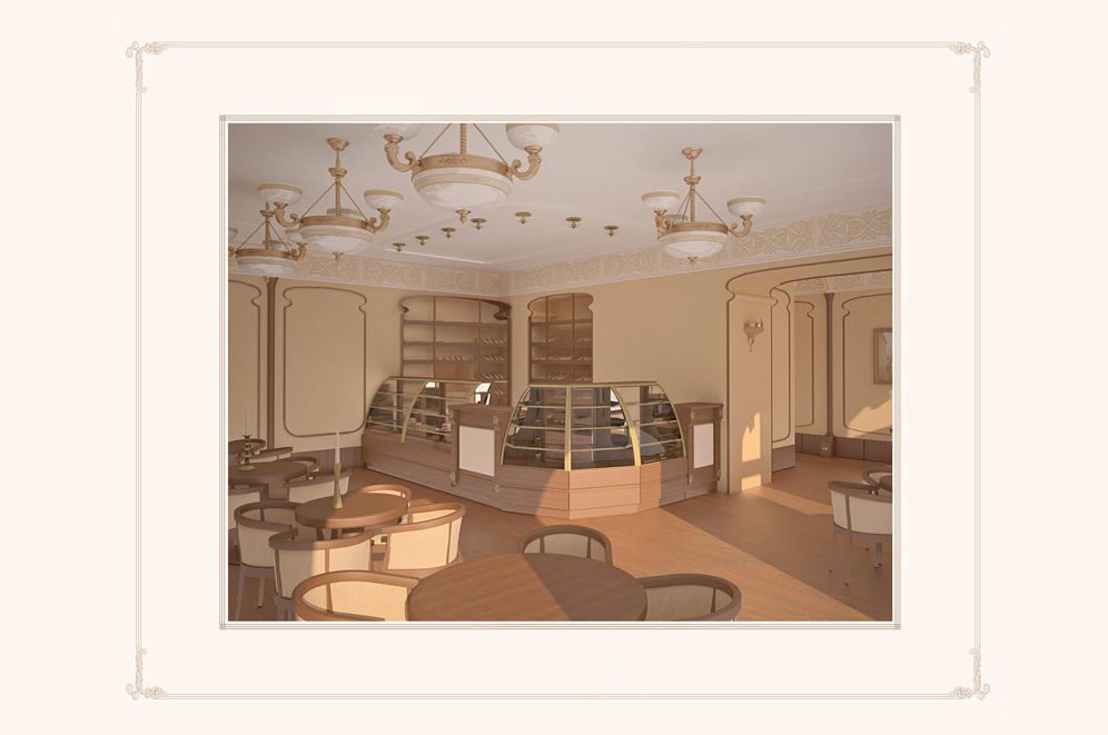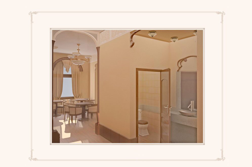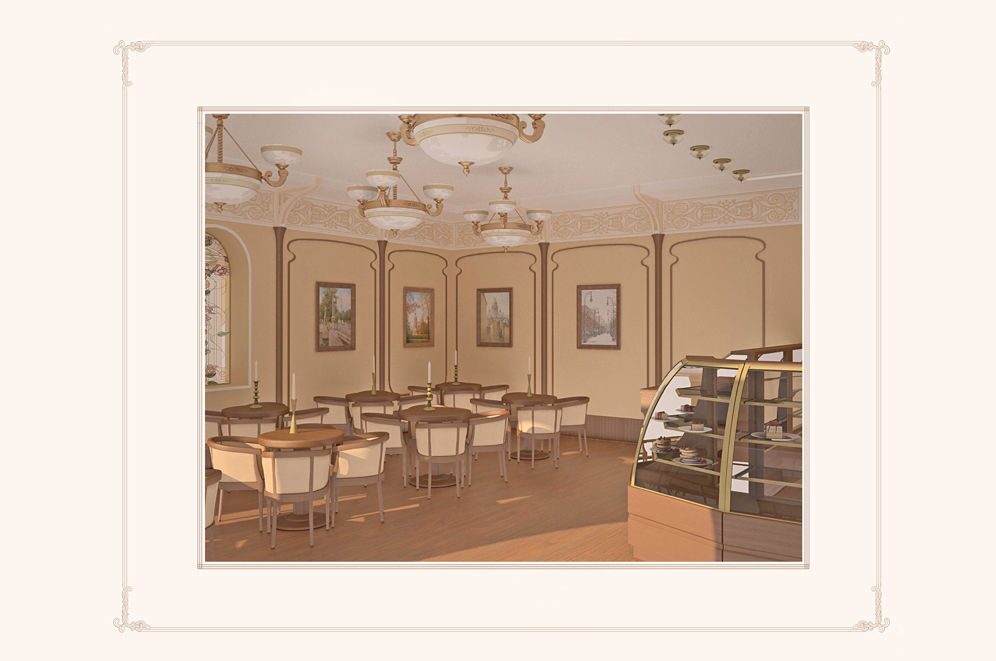 Исторический центр Петербурга изобилует заведениями в современном и футуристическом стиле. Поэтому посетителям, зайдя в кафе, будет приятно и интересно окунуться в атмосферу почти двухсотлетней давности. Мы разработали проект интерьера, в котором стилизация под эпоху Пушкина и Лермонтова органично сочетается с современными понятиями комфорта. Детально продуманный дизайн залов и подсобных помещений, интересные творческие находки, позволяющие новейшим технологиям очень деликатно и ненавязчиво вписаться в романтический стиль 18 – 19 столетия, мягкие пастельные тона, столь любимые в то время, – всё работает на создание лёгкой, приятной, уютной и удобной атмосферы. Всё, что не соответствует романтическому антуражу - системы вентиляции и кондиционирования воздуха, остальные инженерные коммуникации – всё скрыто от взора посетителей, но легко доступно ремонтным службам. Современные реплики старинной мебели при всей внешней схожести с оригиналами обладают самыми современными эргономическими свойствами и намного удобнее своих предшественников. В дизайне кафе продумано всё - и колер стен, и конфигурация окантовки зеркал, и орнамент бордюров, и форма смесителей и светильников. Этот проект пронизан духом, эстетикой и романтикой былого Петербурга.