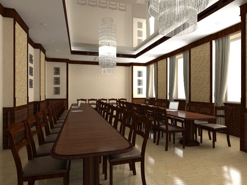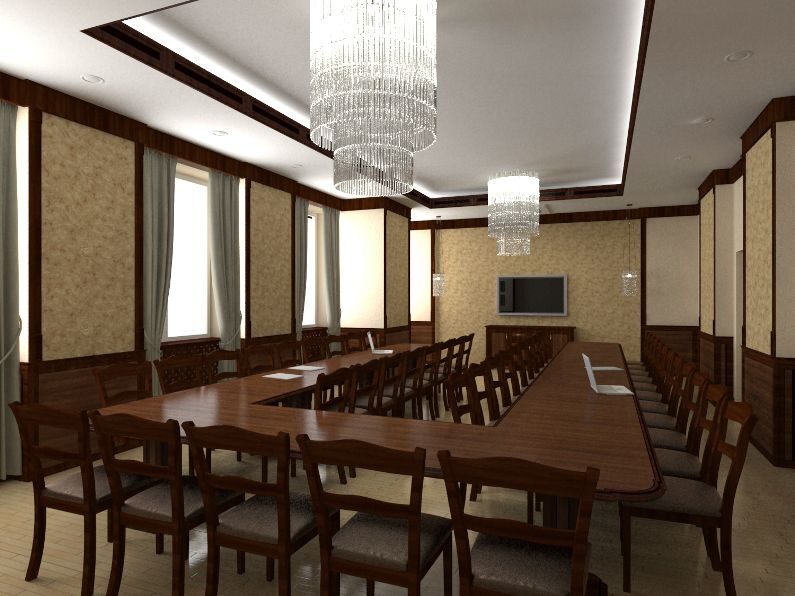 Представленный проект полностью соответствует всем заявленным требованиям. Мягкая, не отвлекающая расцветка стен, строгие, но удобные стулья, большой стол для совещаний, сделанный под этот конкретный зал – всё дышит спокойной солидностью и располагает к продуктивной работе.