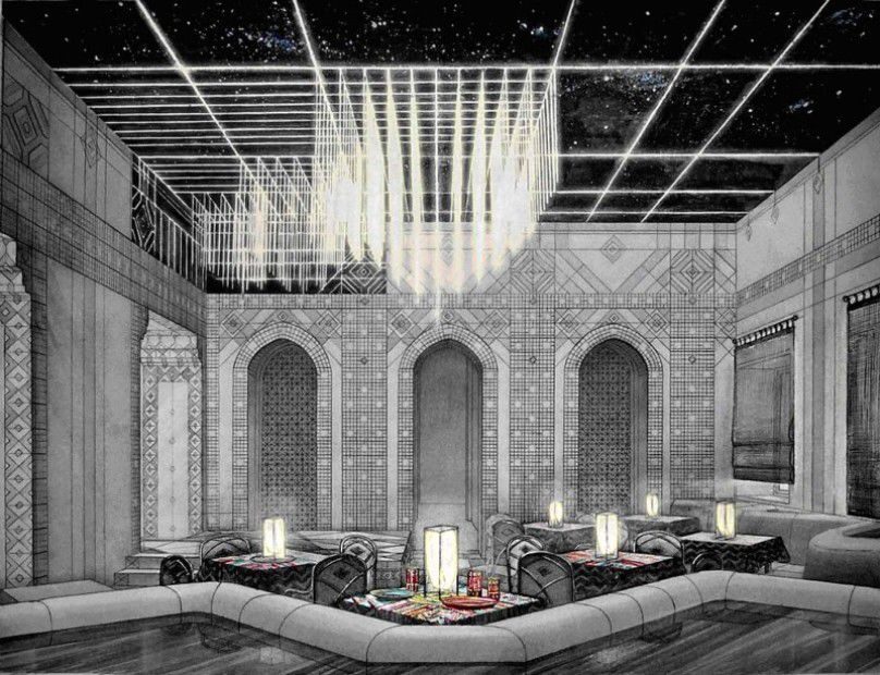 Для того, чтобы законченный дизайн не выглядел этнографической экспозицией, мы взяли общие для всех мусульманских культур элементы и объединили их в единую композицию. Так появились высокие и узкие, как минареты, ниши, арки и двери, яркие краски на стенах, столах и потолке, узорчатые ковры, декоративные ширмы.