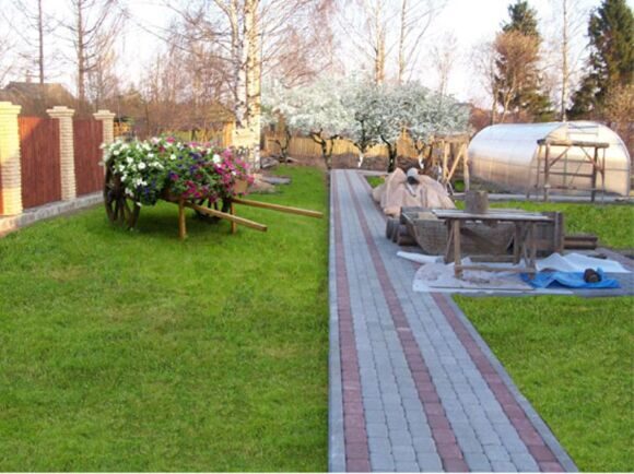 • Тротуарный кирпич — материал для дорожки в саду с традиционной планировкой.