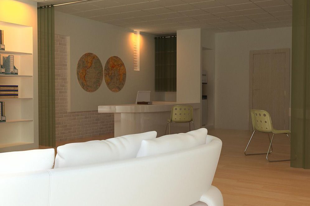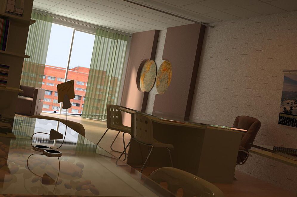 Спокойное цветовое решение, удобная и функциональная мебель, лёгкий налёт экзотики в виде масок и стилизованных географических карт – всё работает на создание имиджа солидной, уважающей себя и клиентов компании.