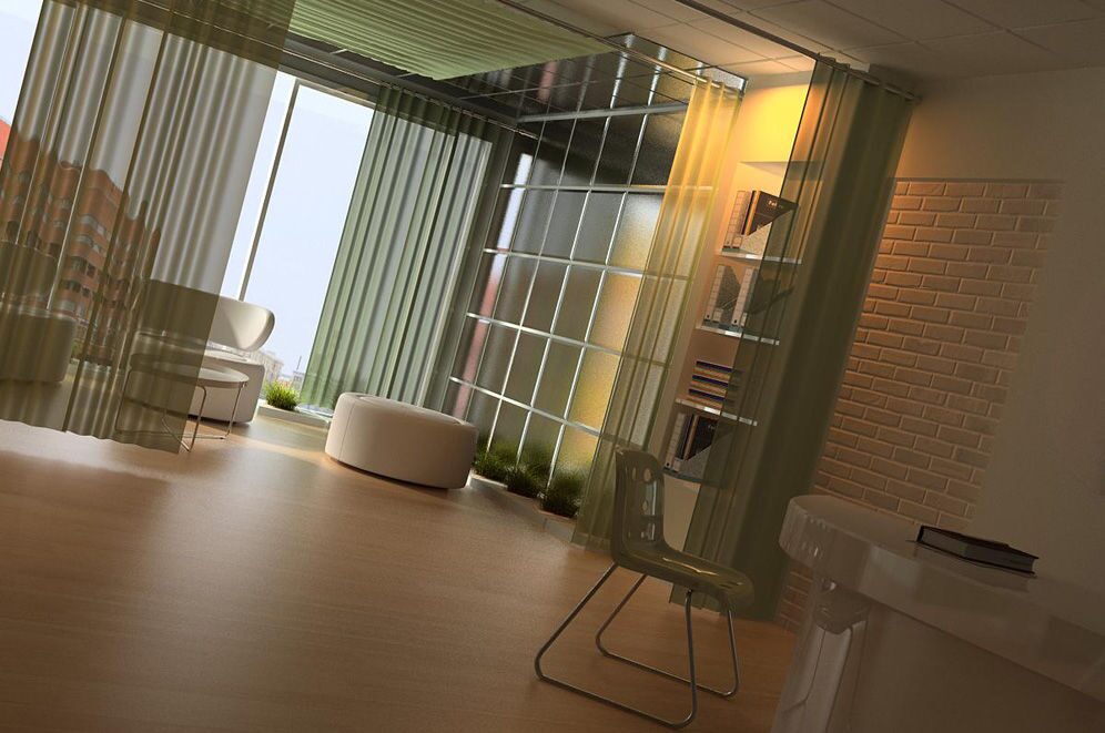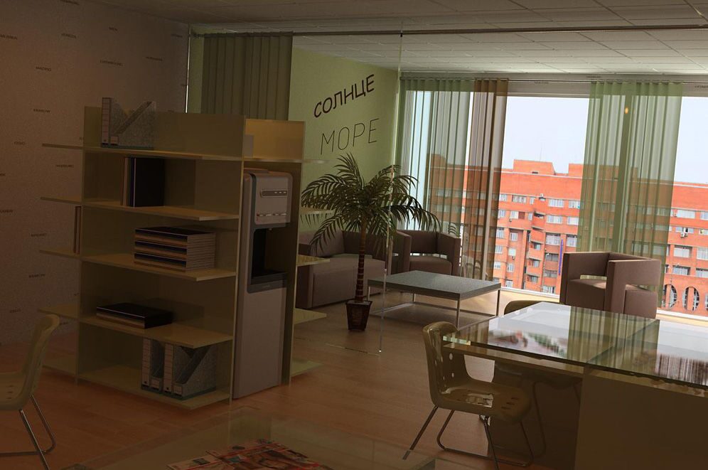 Весь интерьер офиса этой туристической фирмы подчинён идее безграничности пространства и ассоциируется с необычайной лёгкостью перемещения. На это работает и огромное окно, выполняющее функции одной из стен, и обилие света и воздуха, и лёгкие для восприятия светлые оттенки пола, стен, мебели. Удачным можно назвать и любое из двух решений зонирования пространства – отведение части площади у окна под зону отдыха, которую удобно использовать и как переговорную комнату. Её можно отделить стеклянной перегородкой, либо при помощи полупрозрачных драпировок, что создаёт более доверительную атмосферу.