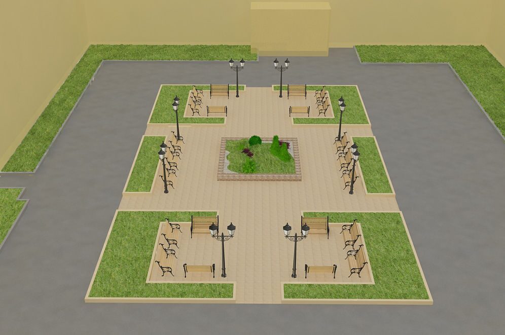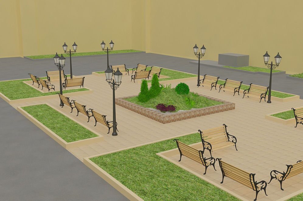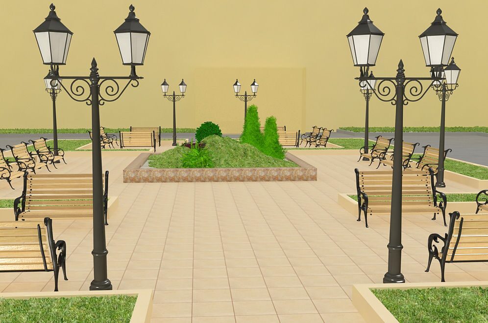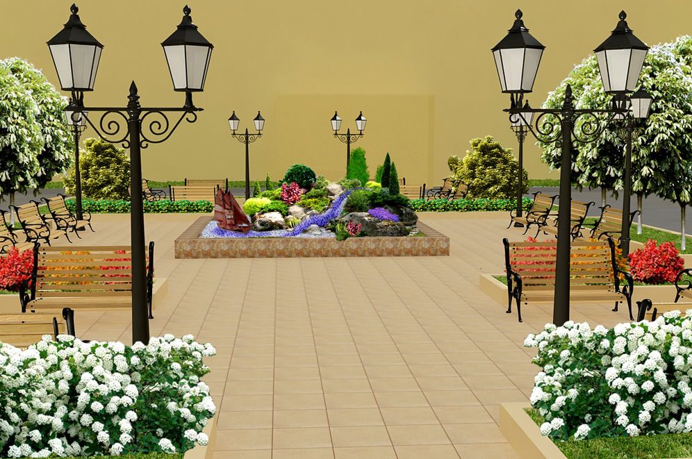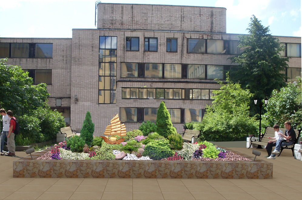 Площадь перед университетом решено было оформить в солидном и сдержанном стиле. Смысловым центром стала композиция, напоминающая одновременно и сад камней, и уголок ботанического сада, и альпийскую горку. Эта композиция была окружена каменным бордюром, как бы ограждающим природную красоту от надвигающейся урбанизации. Вокруг было проведено мощение дорожек и площадки каменными плитами. На просторной площадке мы разместили малые архитектурные формы: скамейки для отдыха, оригинальные фонари и урны для мусора. Сочетание строгой геометрии газонов и заасфальтированных или выложенных плиткой участков с иррациональной растительной композицией в центре и ретро фонарями получилось очень интересным и элегантным.